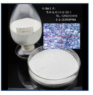 圖中有顯微放大讀數,表面看是白色粉末狀,40倍放大顯現透明玻璃珠形狀。色澤判斷質量,越白越優質。反之,越暗噴砂出來的產品也越暗。