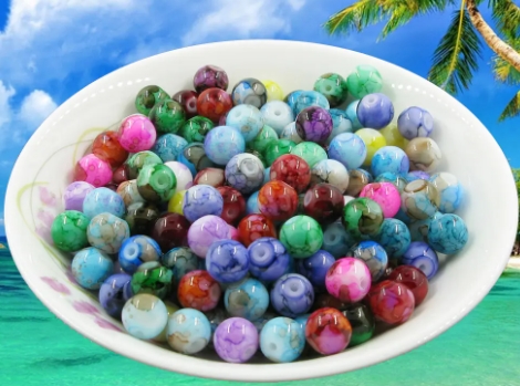 一般來說彩色玻璃珠并不是很大,直徑在1.5~5厘米之間,大多數都是透明的,而在顏色上則會在表面、內部等有各種不同的顏色。在工廠制作時,首先需要將玻璃珠的原材料融化,也就是在高溫的環境下融化二氧化硅。然后再結合實際顏色的需要,將不同顏色的二氧化硅融合在一起。接著將融化后的玻璃按實際要求的尺寸進行裁剪。在完成裁剪后,玻璃珠會直接進入滾動溝槽內,在溝槽滾動的過程中,帶動玻璃珠滾動。然后再經過一段相對較長的導軌,隨著玻璃做的滾動,其溫度也會不斷的下降。冷卻后就形成我們看到的彩色玻璃珠了。